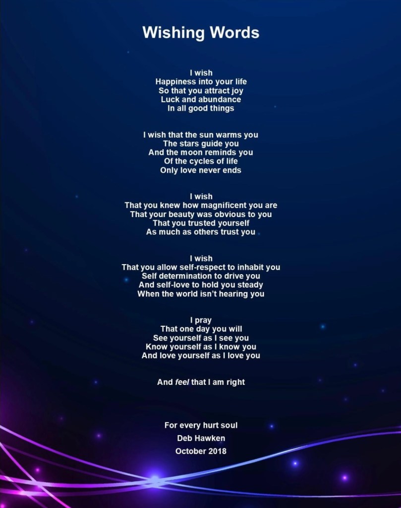 I'm a writer, public speaker, medium, and spiritual thinker. I suffered from acute anxiety from the age of 16 until I was well into my 50s, when I finally found methods that helped me to put it behind me. My struggles led to me exploring life through poetry, then plays, and over a 15 year period I made notes for a self help book which I published in 2015. Details on the book page. Although I am a psychic medium and loved the work, it didn’t feel right for me. It was an utter privilege, but my path was the exploration of what it means to be spirit in the real world and how we can make practical use of those abilities. Nowadays I write, blog, and teach soul-centred living, which is a gentle way of undoing past programming and connecting to your essential self, or soul. If you’re interested email me and we can chat. No pressure, it’s right for you or it’s not and you will know. The groups meet on line so no going out on cold, wet, winter’s evenings. On a personal note, I’m based in the UK. Married with five cats, no children, and four grandchildren, thanks to our inherited daughter, who has gifted us four beautiful little people that bring us such joy. Hope you enjoy the blogs. Deb xx