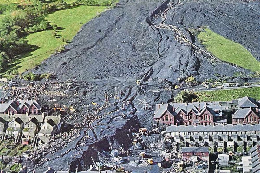 If you don’t know of it, a coal slag heap above a town in Wales suddenly shifted, plummeted downhill at high speed, and buried parts of a village, the most devastating of all was a school.
