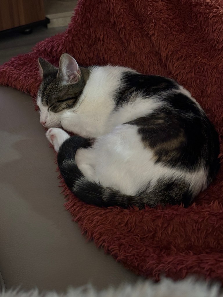 I kid you not, the kittens are far too busy knocking over houseplants to sit and settle with us, yet when Tony was resting after a leg injury, these two girls sat with him for hours. They know.
