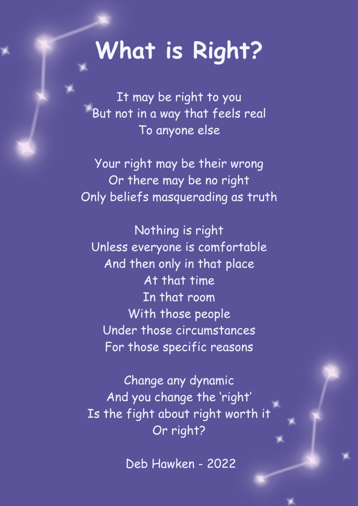 I'm a writer, public speaker, medium, and spiritual thinker. I suffered from acute anxiety from the age of 16 until I was well into my 50s, when I finally found methods that helped me to put it behind me. My struggles led to me exploring life through poetry, then plays, and over a 15 year period I made notes for a self help book which I published in 2015. Details on the book page. Although I am a psychic medium and loved the work, it didn’t feel right for me. It was an utter privilege, but my path was the exploration of what it means to be spirit in the real world and how we can make practical use of those abilities. Nowadays I write, blog, and teach soul-centred living, which is a gentle way of undoing past programming and connecting to your essential self, or soul. If you’re interested email me and we can chat. No pressure, it’s right for you or it’s not and you will know. The groups meet on line so no going out on cold, wet, winter’s evenings. On a personal note, I’m based in the UK. Married with five cats, no children, and four grandchildren, thanks to our inherited daughter, who has gifted us four beautiful little people that bring us such joy. Hope you enjoy the blogs. Deb xx