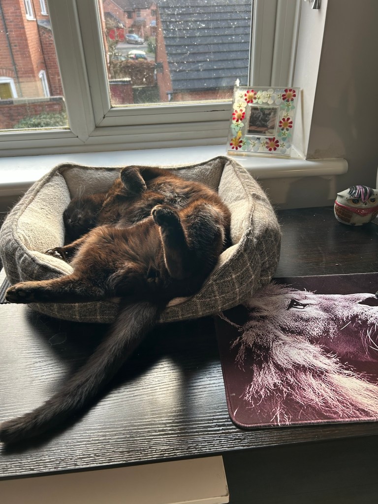 Nero was mummy cat, yes he’s a boy, but he mothered those kittens from the moment they arrived. She will often cuddle up with him in the wardrobe. He’s also brown.
