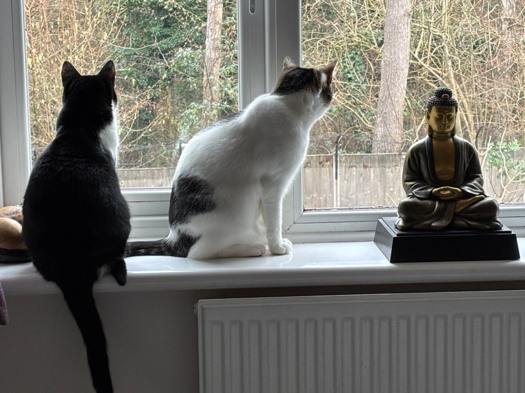 Mimzy, her sister, is garden playmate and second cuddler in command. Lily likes to have Mimzy close in case she needs help hunting wildlife – which is heavily frowned upon! Mimzy is white with black and brown markings.