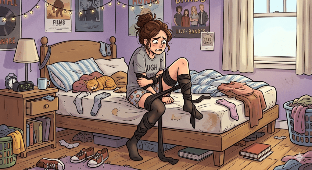 Something a male reader may not know is that a good pair of shaping tights are so strong that pulling them up is similar to trying to get a whole marrow into one finger of a glove; it’s an exercise in brute strength and determination verging on desperation and risking dislocation.